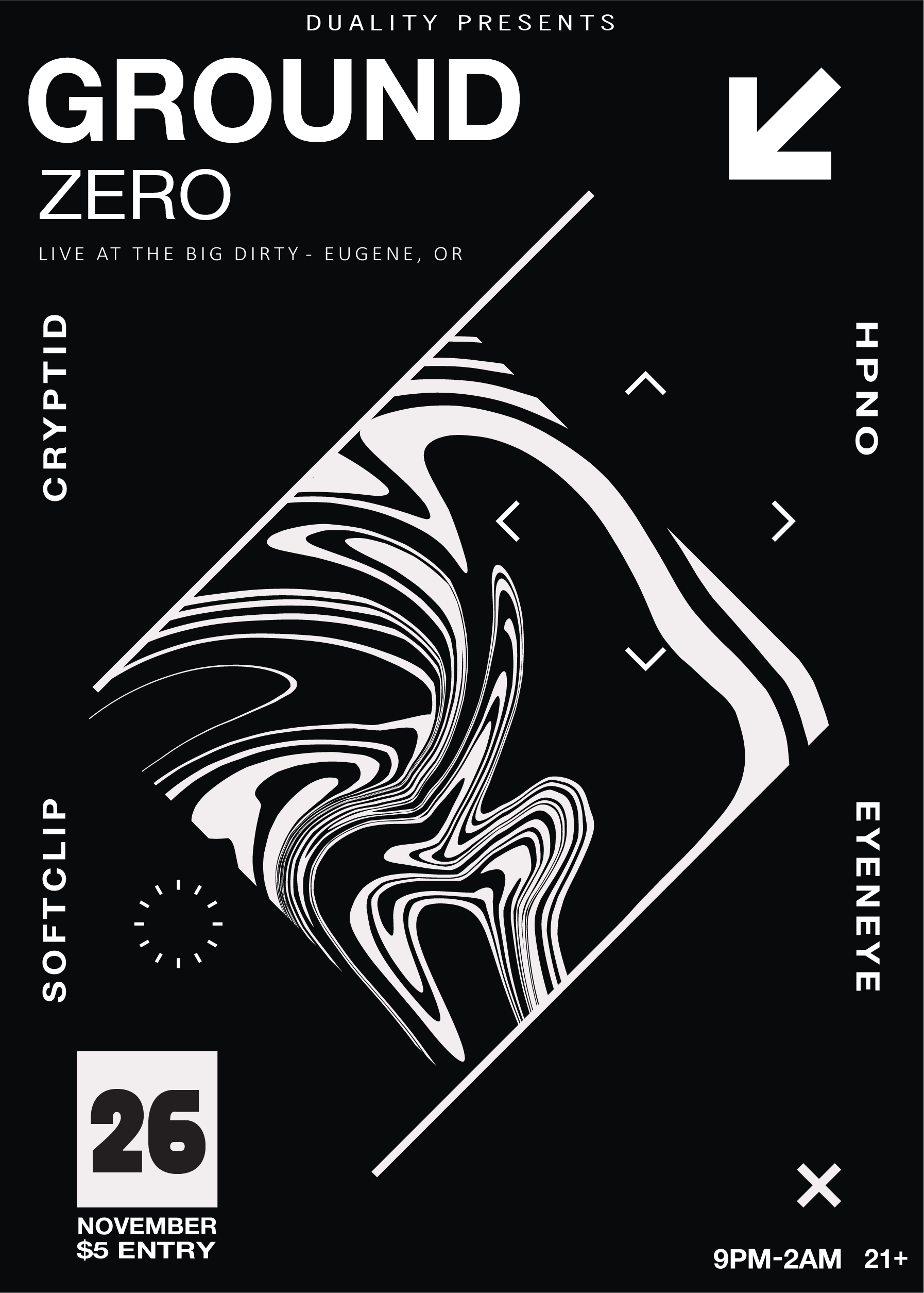 Duality Events Presents GROUND ZERO - a nod to the foundation of modern day electronic music featuring Hpno, Cryptid, Softclip, and Eyeneye at The Big Dirty on November 26!