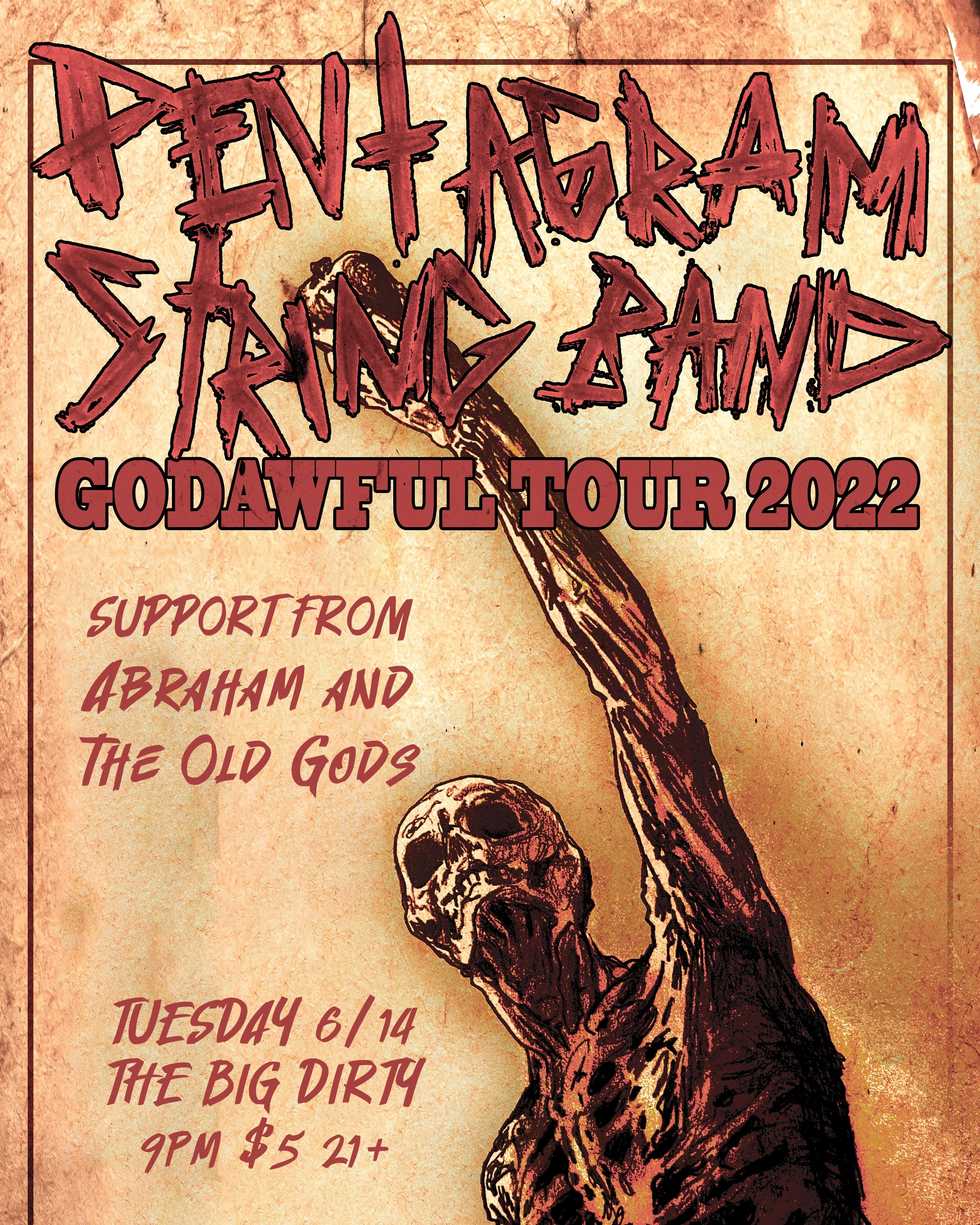 Back to All Events Pentagram String Band with Abraham and the Old Gods Tuesday, June 14, 2022 9:00 PM 11:55 PM The Big Dirty 844 Olive Street Eugene, OR, 97401 United States (map) Google Calendar ICS Kansas City, MO-based satanic bluegrass group, The Pentagram String Band are mystifying The Big Dirty on Tuesday, June 14 with support from Alabama roots rockers Abraham and the Old Gods.———————————————21+ | Masks EncouragedTickets: $5Time: 8PM Doors, 9PM Show
