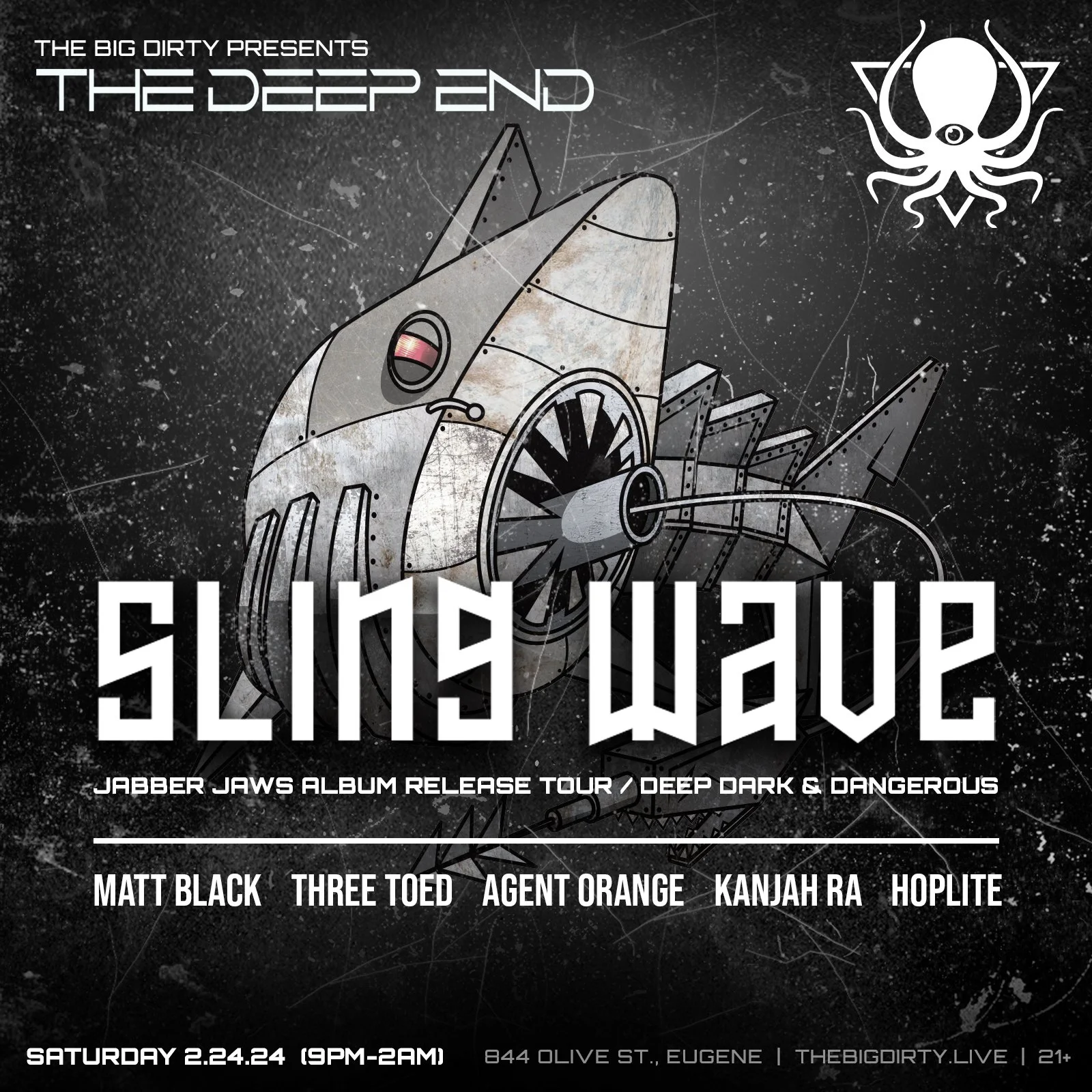 The planets and stars have aligned and THE DEEP END is in full swing for the New Year as we are proud to announce the arrival of SLINGWAVE on his Album Release Tour for JABBER JAWZ on DEEP DARK & DANGEROUS!!! This will be SLINGWAVES 2nd stop on the west coast leg of the tour having just torched San Diego last week!!! We have stacked the line up for this one with the return of THREE TOED along with Big Dirty debuts from AGENT ORANGE and HOP LITE with MATT BLACK on direct support. Kanja Ra will be kicking us off with a special early open VIBE performance at 8pm to begin our journey into that special place we know and love. Join us for a night of Deep Dubstep....West coast Drip....Halftime and Drum&Bass IN THE DEEP END OF THE BIG DIRTY Saturday, February 24th!!!
