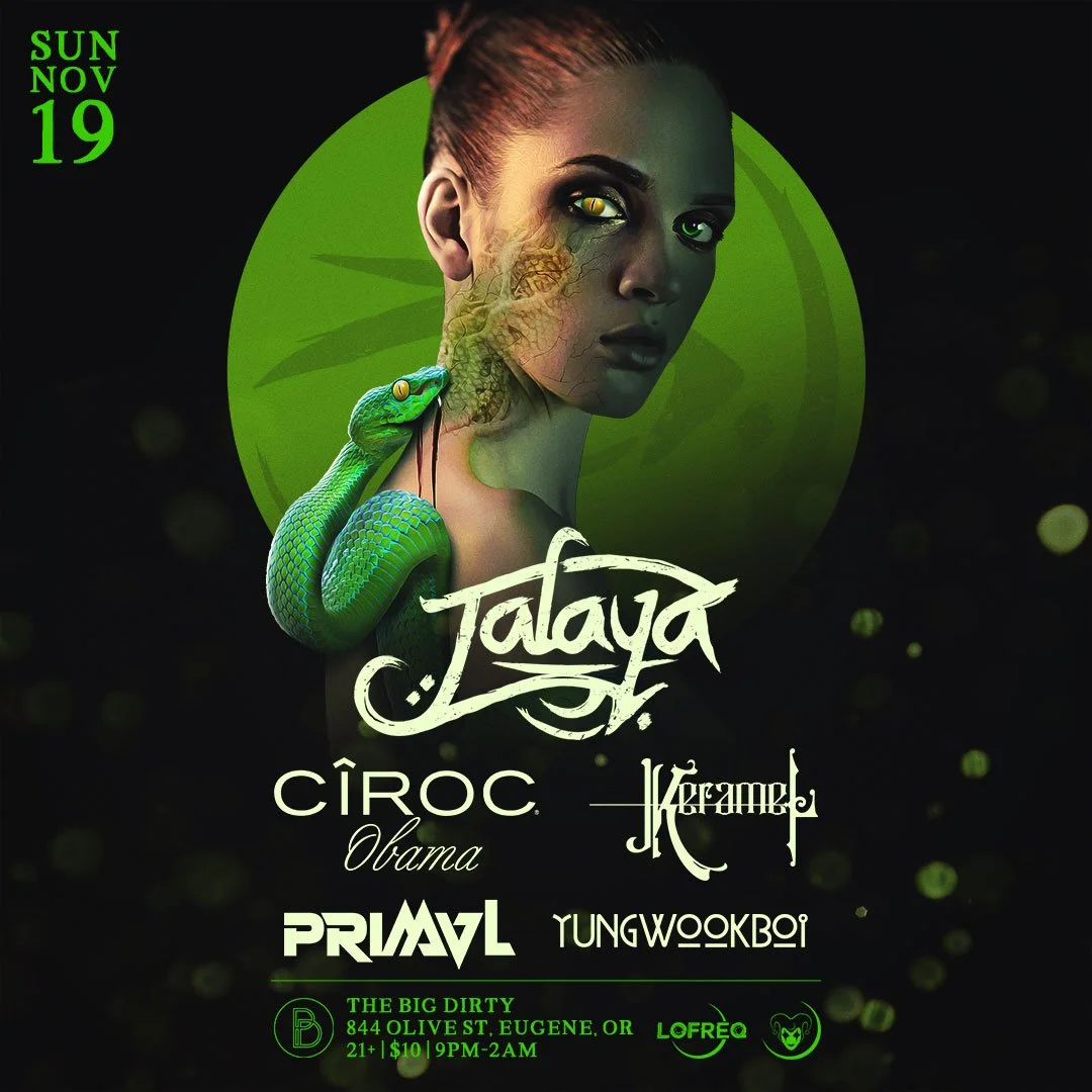 The next up Subversive Sunday by Subversive Events features co-creator of Lo Freq Records, Jalaya, along with a strong support lineup featuring Portland's own Ciroc Obama and Keramel along with Eugene favorites Youngwookboi and PRIMVL on Sunday, November 19 at The Big Dirty!