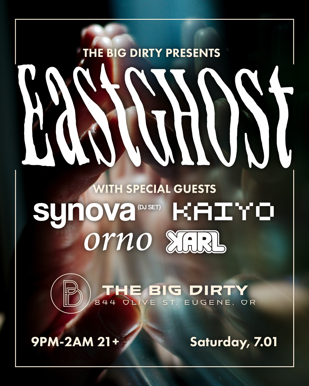 A whole crew of PNW-beloved producers are headed to The Big Dirty on Saturday, July 1! Headlined by EASTGHOST with special guests Synova (DJ Set), KAIYO, and support from Orno and Karl, this stacked lineup is about to be one for the books!