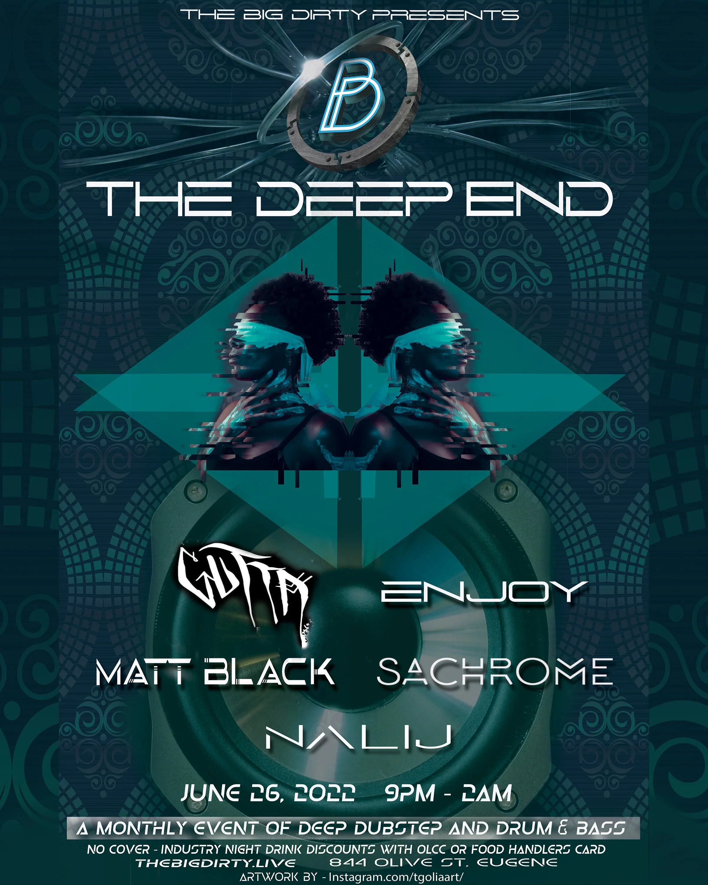 Jump in... THE DEEP END! This is a monthly event for deep dubstep and D&B! SINK IN with Gutta, Enjoy, MattBlack, SaChrome, and Nalij! This NO COVER event includes industry night drink discounts with OLCC or food handlers' card. ——————————————— Ages 21+ Tickets: FREE COVER! Time: 8PM Doors, 9PM Show