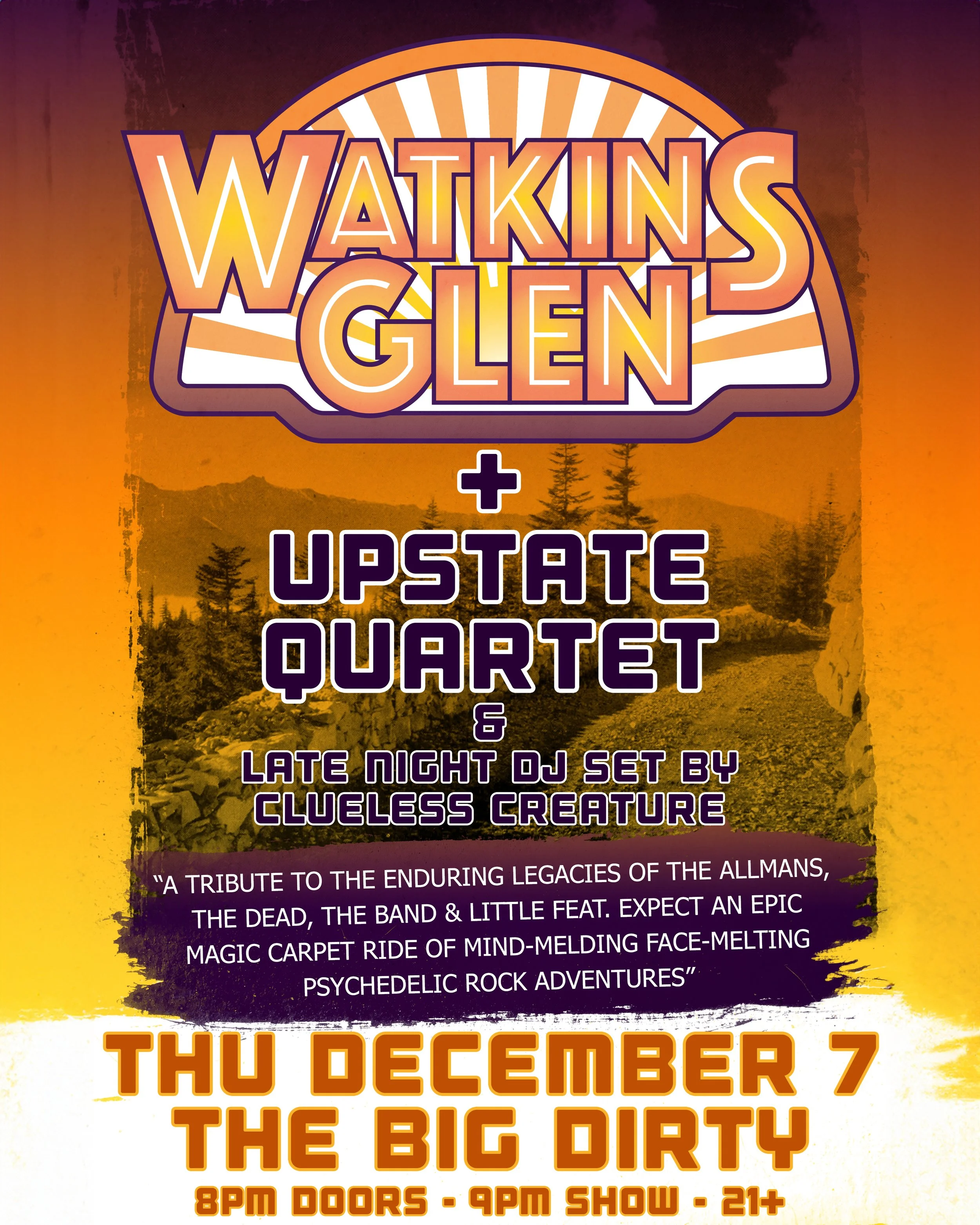 Watkins Glen brings a magic carpet ride of mind-melting psych-rock adventures to The Big Dirty with the Upstate Quartet and a late night DJ set from Clueless Creature on Thursday, December 7!